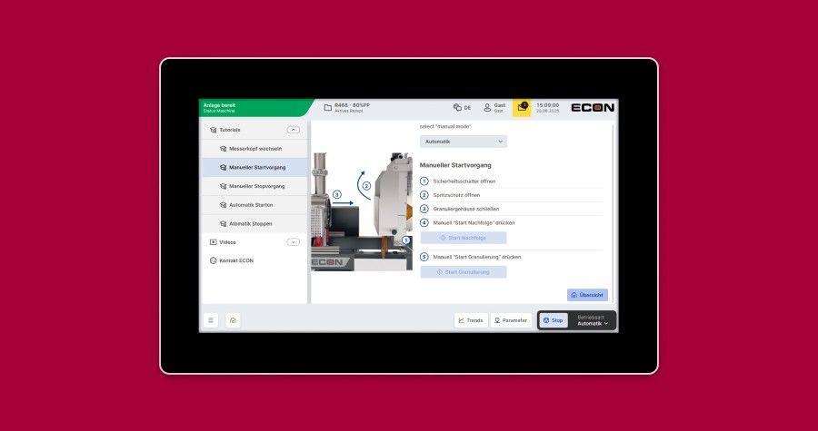 Die Rezepte lassen sich unkompliziert anlegen, verwalten und anwenden – für schnelle Materialwechsel ohne Umwege. HELIO übernimmt dabei die komplette Rezeptverwaltung und entlastet die begrenzten PLC-Ressourcen. Für weniger erfahrene Maschinenbediener:innen stehen neue Schritt-für-Schritt-Anleitungen bereit, die den Einstieg in die Arbeit mit dem ECON-Granulierer deutlich erleichtern. Gleichzeitig profitieren auch erfahrene Anwender:innen von der gezielten Unterstützung bei seltener durchgeführten Wartungs- und Instandhaltungsaufgaben. Für ECON war es entscheidend, ein Interface zu schaffen, das sowohl technisch überzeugt als auch in der Praxis funktioniert.