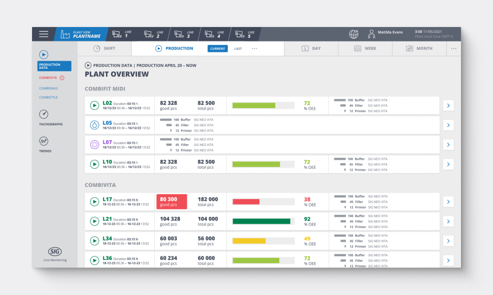 Das SIG Line Monitoring hilft, die Leistung einer SIG Abfüllmaschine und einer kompletten Abfülllinie zu visualisieren, zu messen und den Produktionsbetrieb zu verbessern. Wir haben eine intuitiv bedienbare Benutzeroberfläche geschaffen, die komplexe Daten mit leicht verständlichen Grafiken visualisiert und es dadurch ermöglicht richtige Entscheidungen zu treffen und zu verstehen, wie gut eine Füllanlage arbeitet.